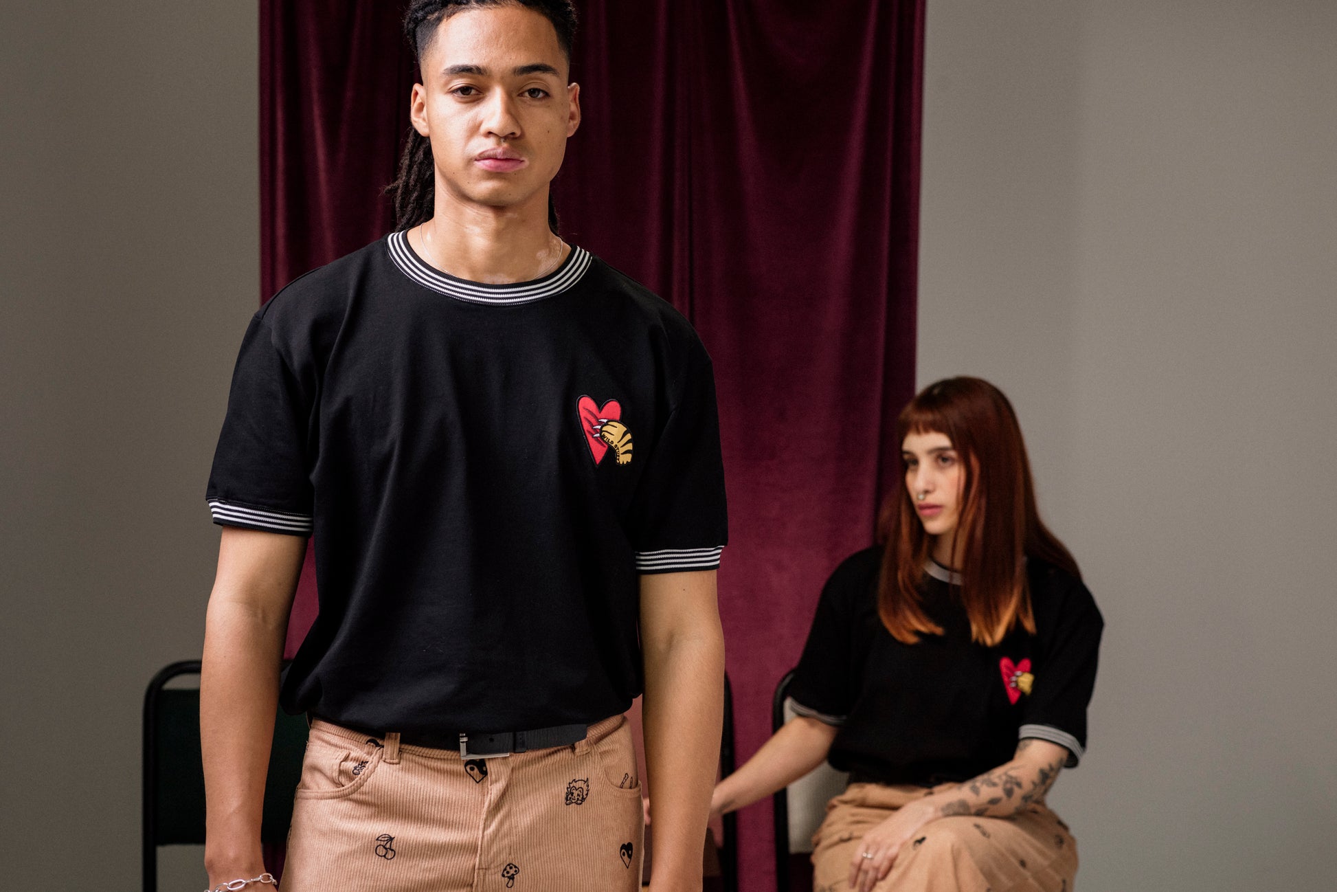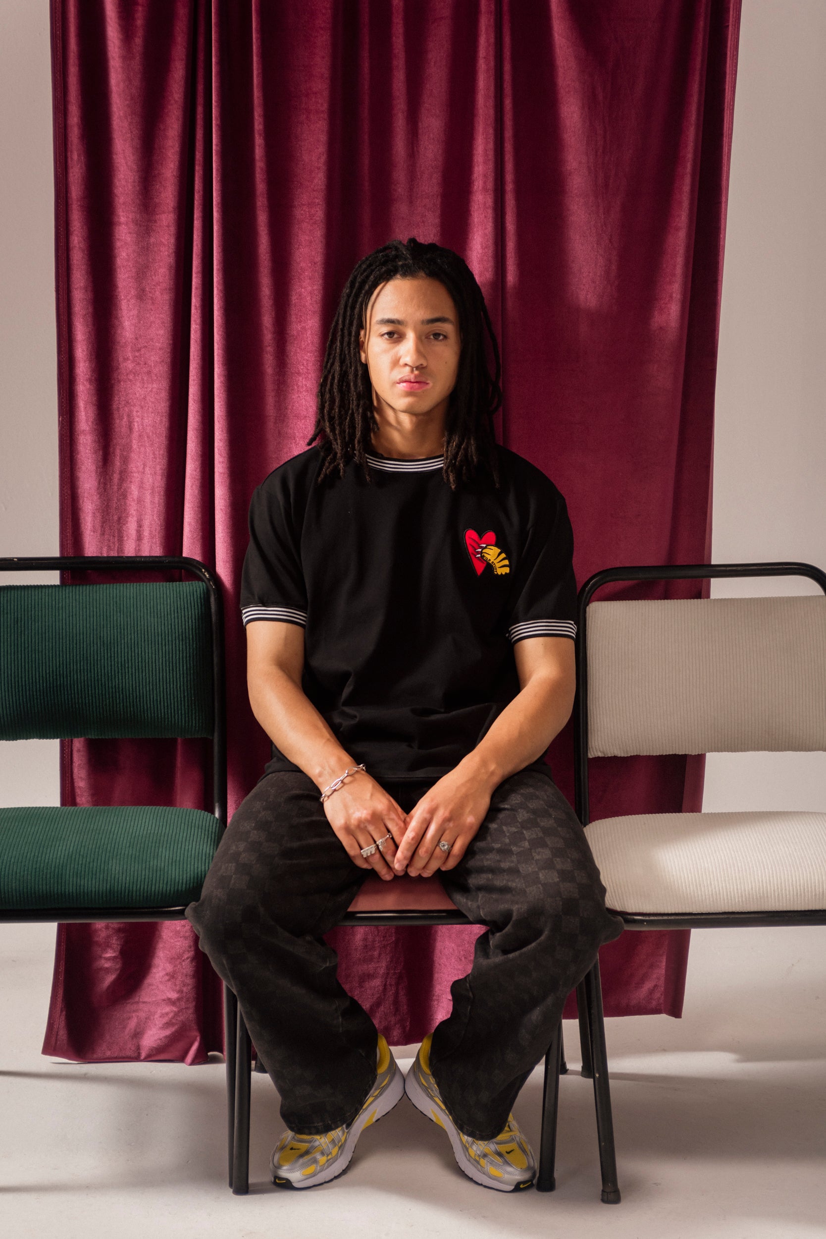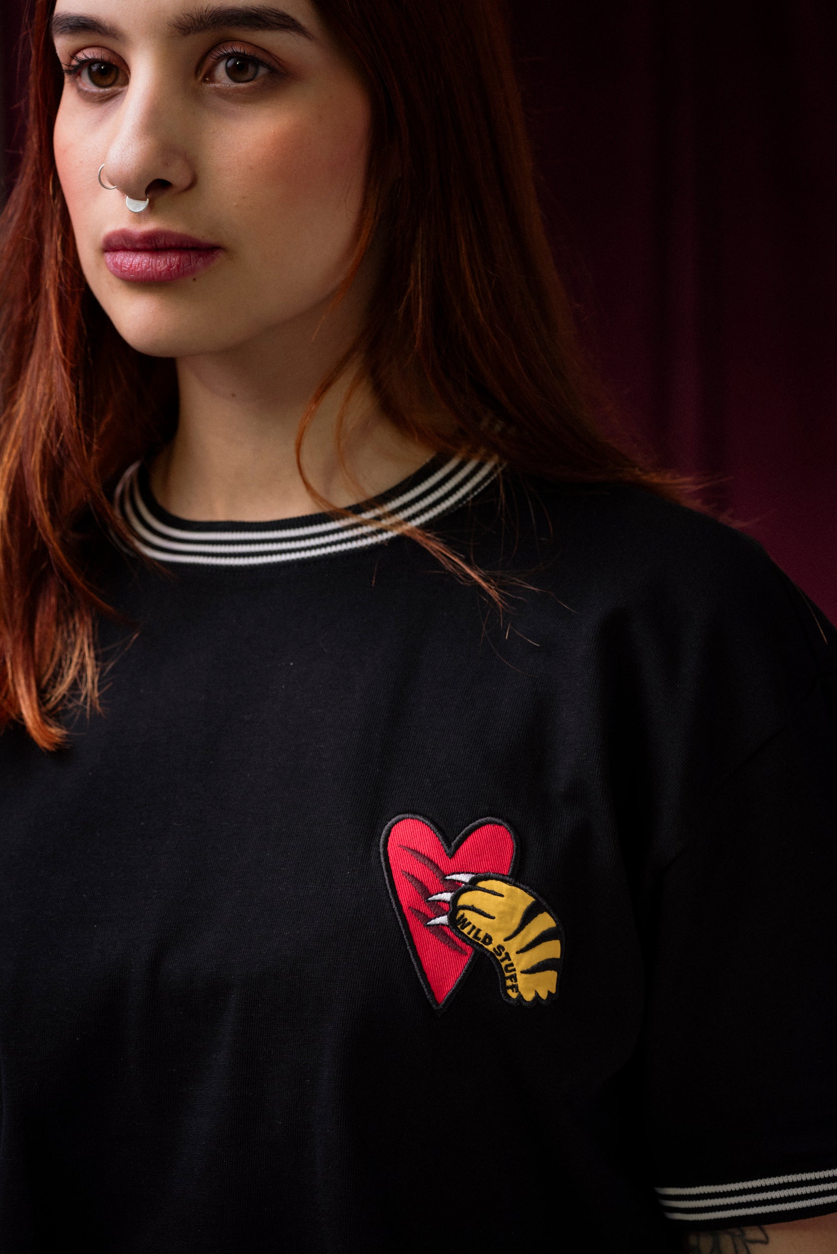 Camiseta manga corta oversize hecha en franela negra 100% algodón de 260 gr con cuellos y puños tejidos en rayas marfil-negro y aplique bordado en punto corazón.