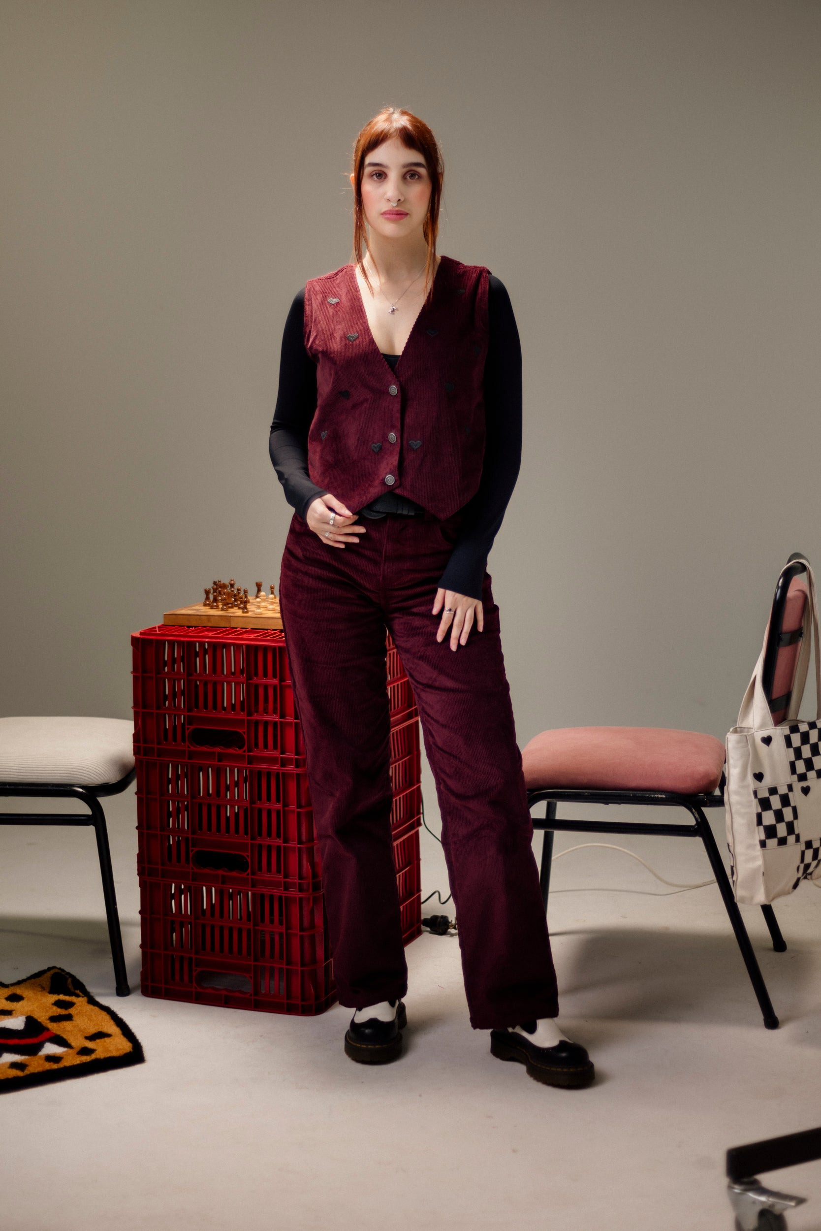 Chaleco hecho en corduroy vino 98% algodón 2% spandex con bordado de corazones negros en frentes. Tiene forro interno.