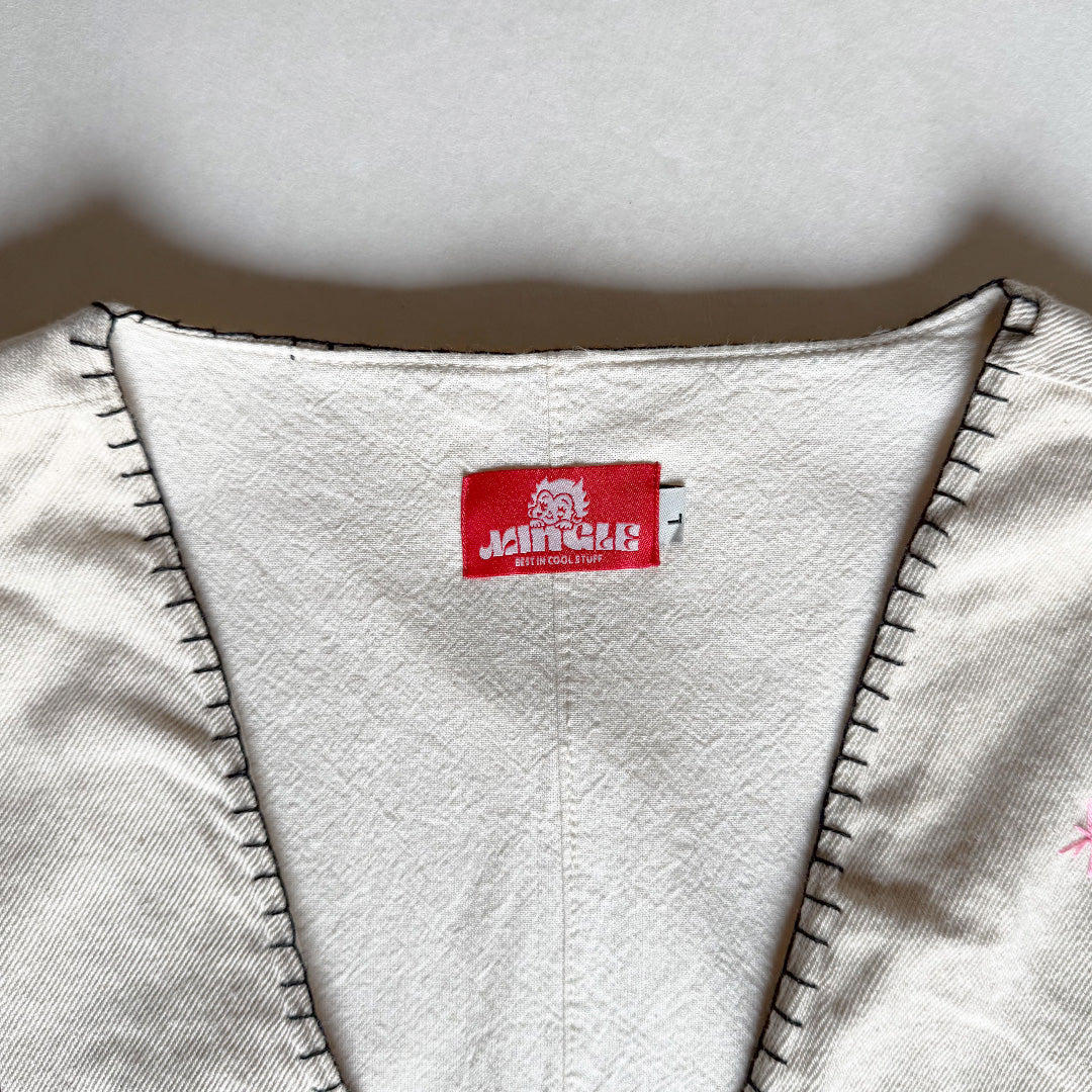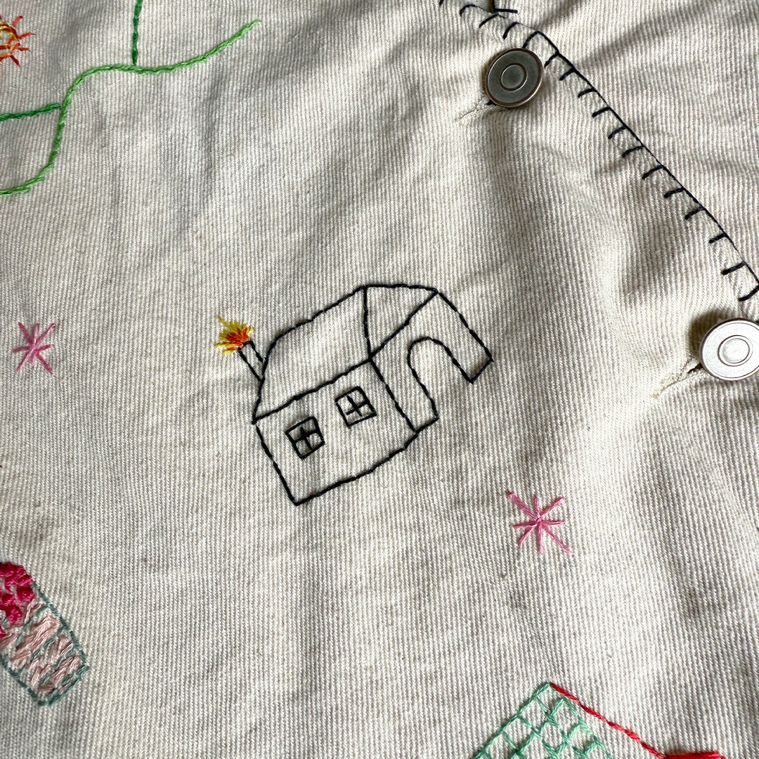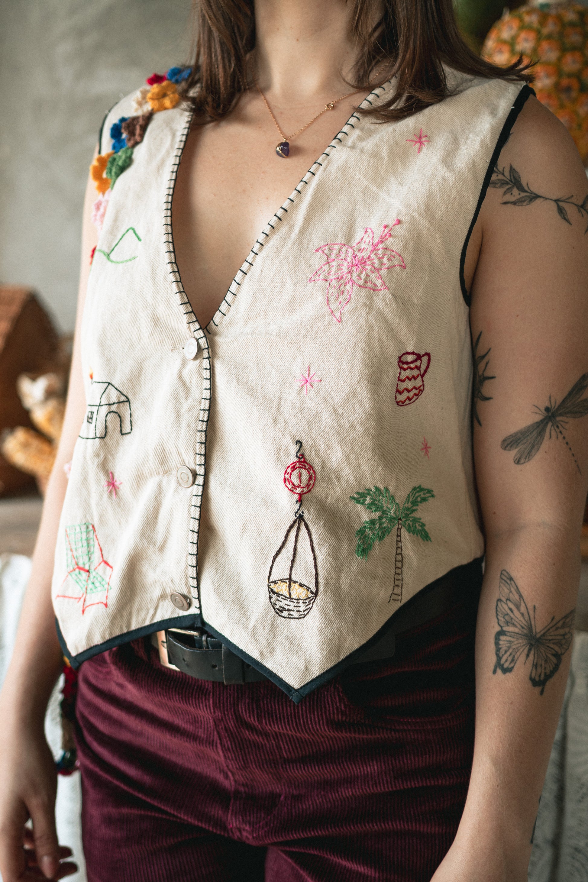 Chaleco hecho en drill marfil 100% algodón con forro interno, tiene lavado suave. Esta pieza es única y especial, bordada completamente a mano.