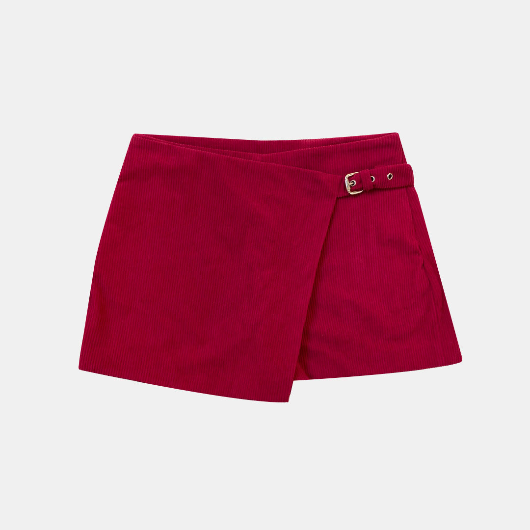 Falda short tipo sastre hecha en corduroy vino de canal ancho con hebilla tensora en frente.