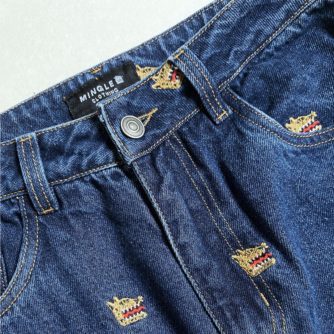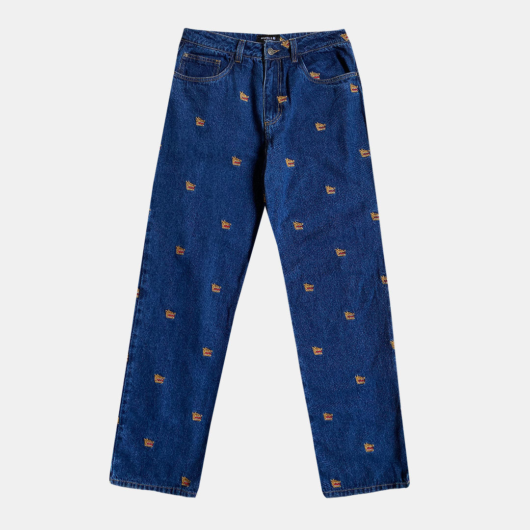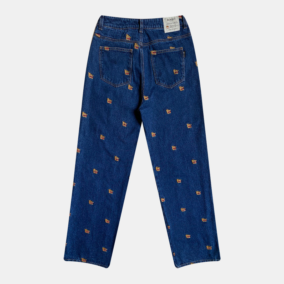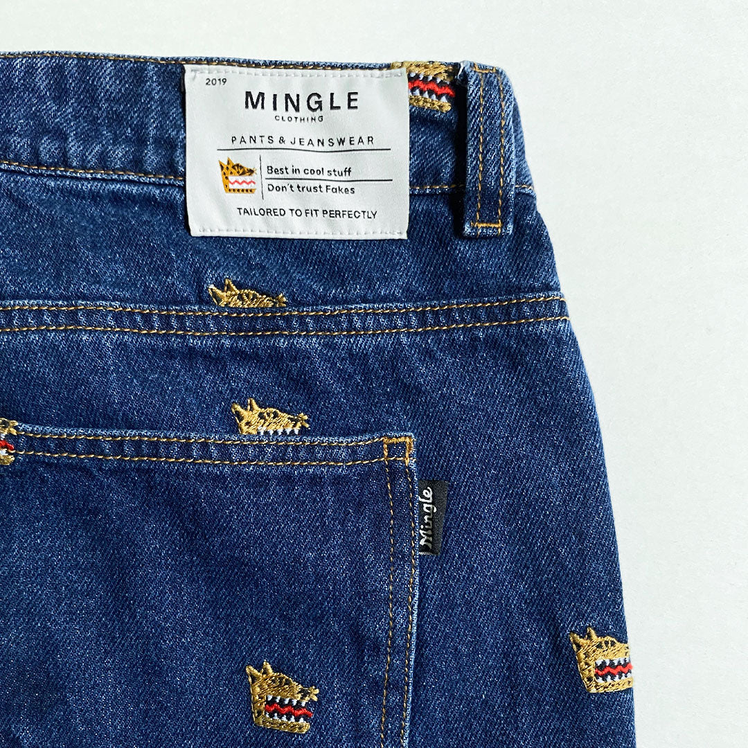 Jean de silueta recta con 5 bolsillos hecho en denim azul 100% algodón con bordado logo MNGL. Lavado azul medio.